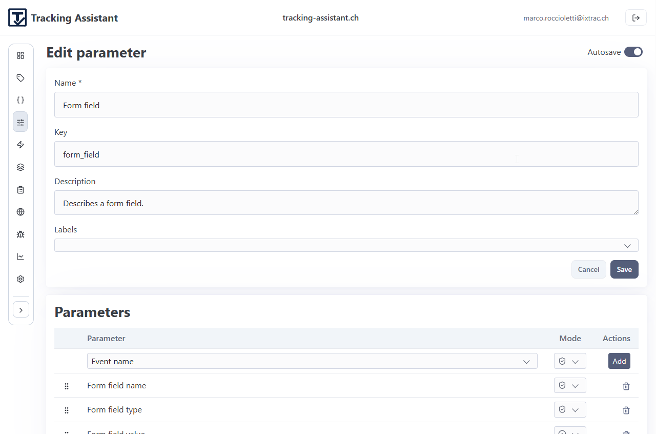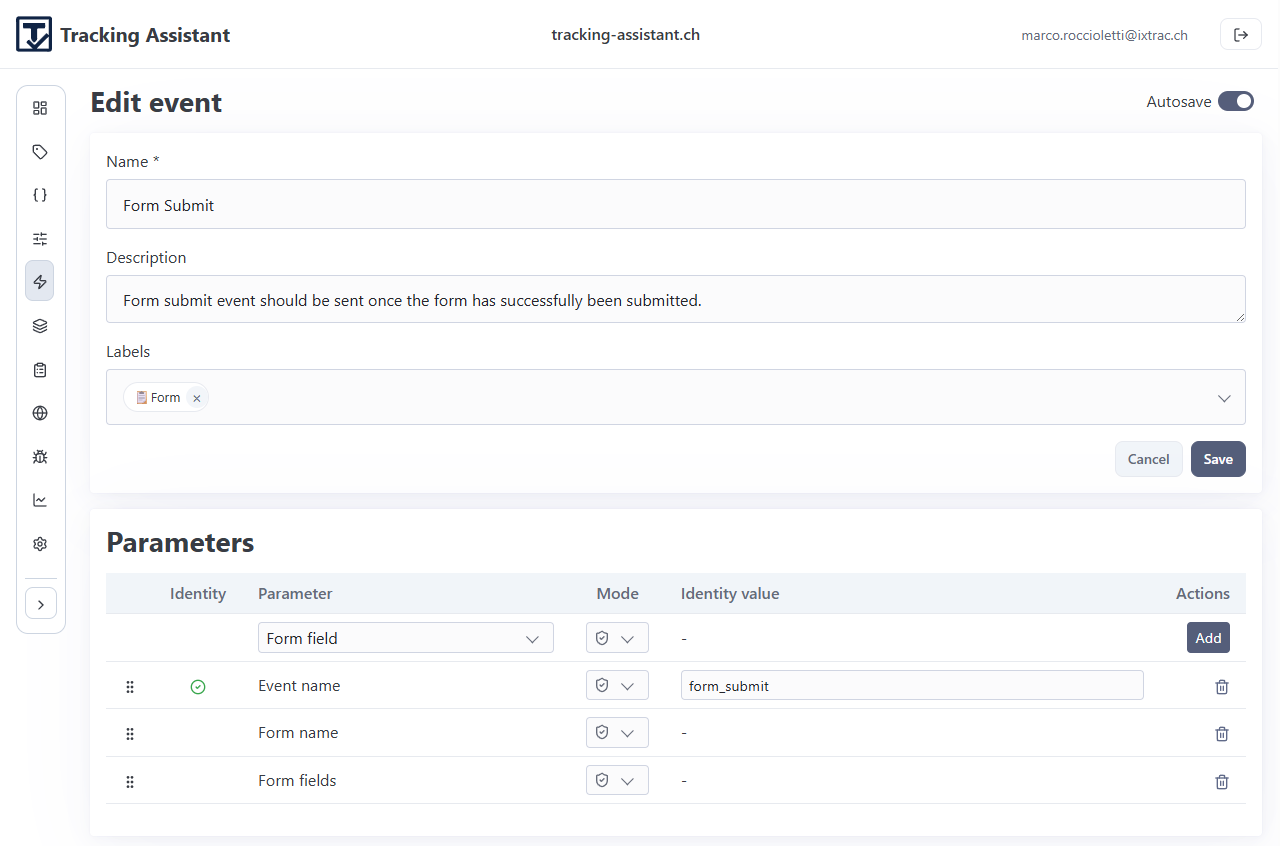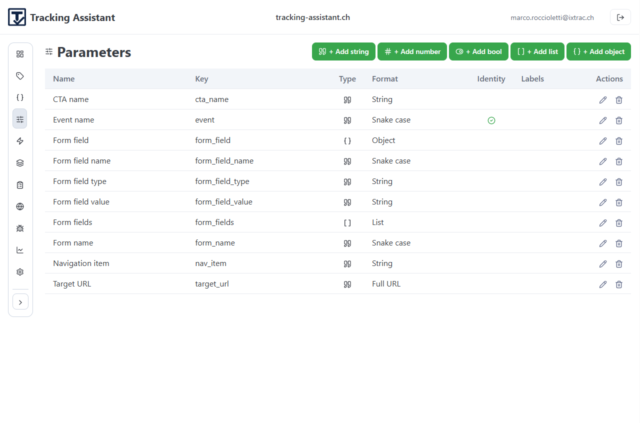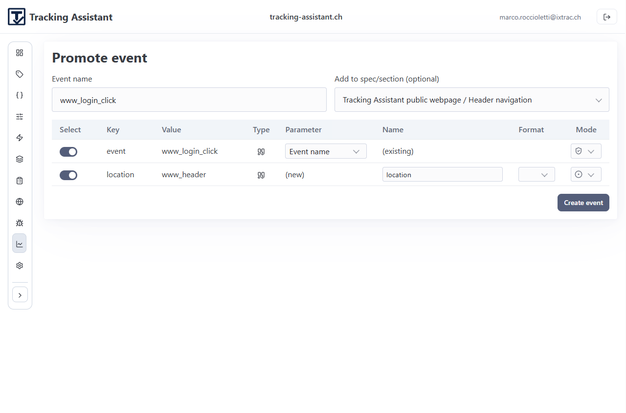 - Event: a named tracking event with linked parameter expectations.